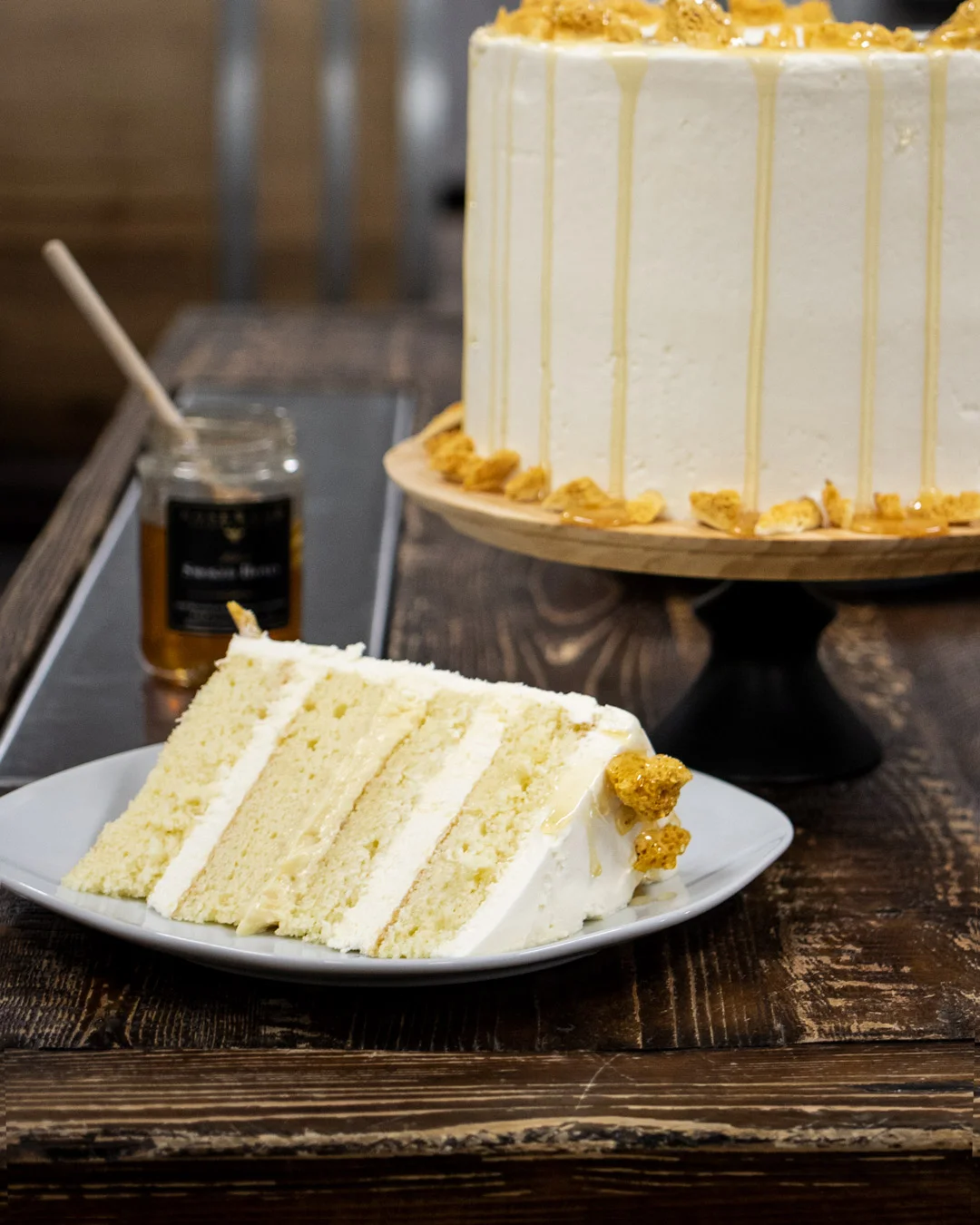 11. The final step of this entire cake is to drizzle Rosewood Smoked Honey around the top edges of the cake until it begins to drip down the sides of the cake.